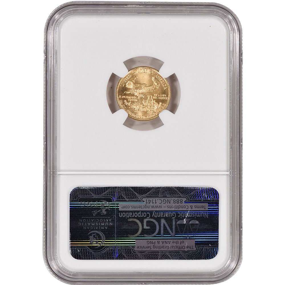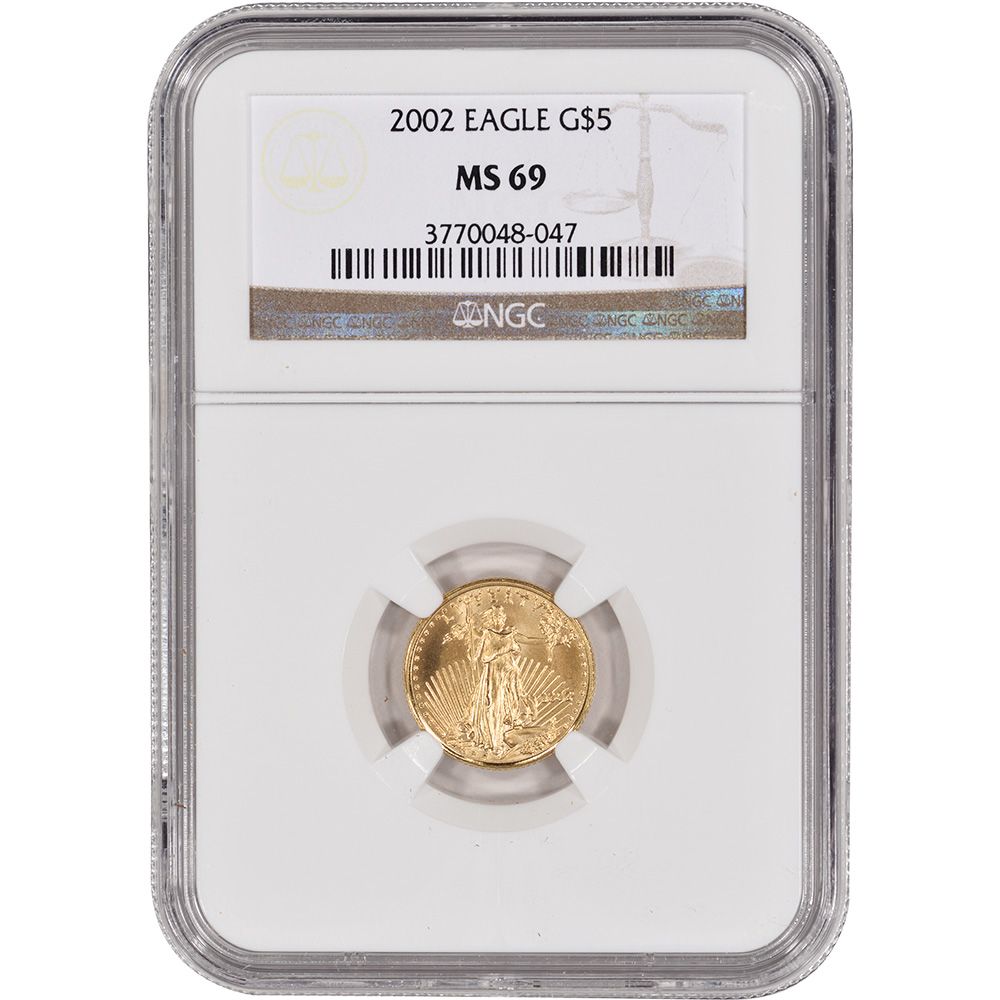 2002 1/10 oz Gold American Eagle MS-69 NGC **|**|** 2002 1/10 oz Gold American Eagle MS-69 NGCYear ***2002Grade***MS-69Denomination**50Dim.**32.7Thick:**2.87mm ; MSRP: $900