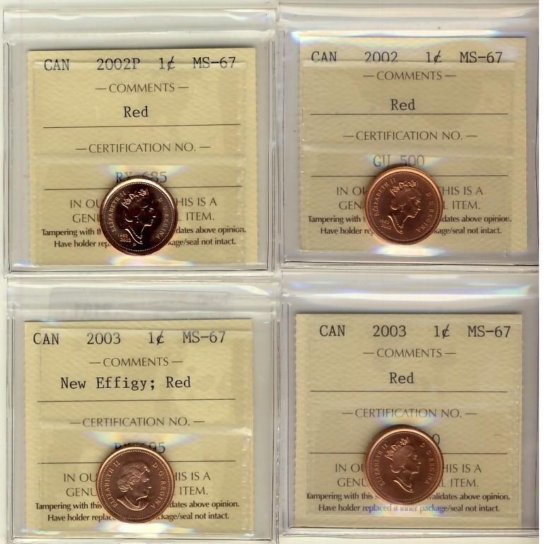 2002 1¢, 2002P, 2003, 2003 New Eff ICCS MS67RD. Lot of 4 coins