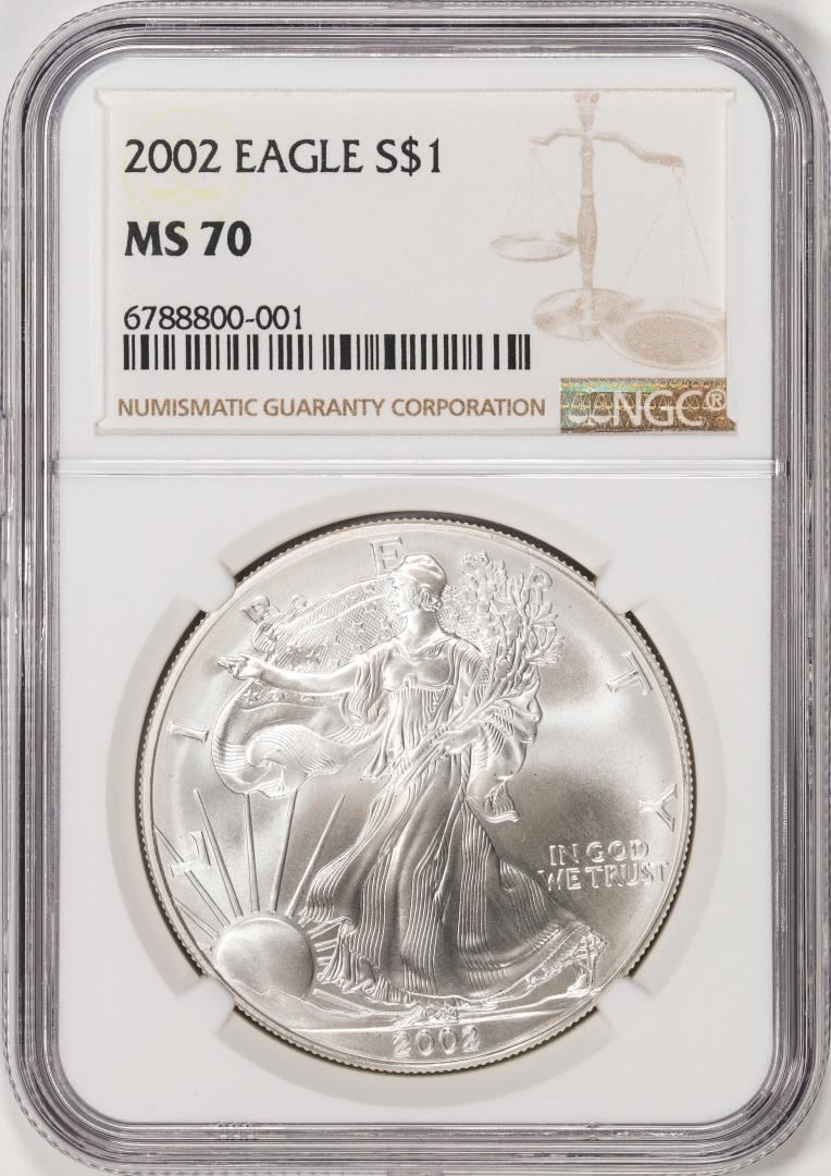 One 2002 $1 American Silver Eagle Coin NGC MS70. NGC Certified.