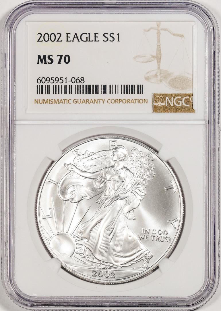 One 2002 $1 American Silver Eagle Coin NGC MS70. NGC Certified.