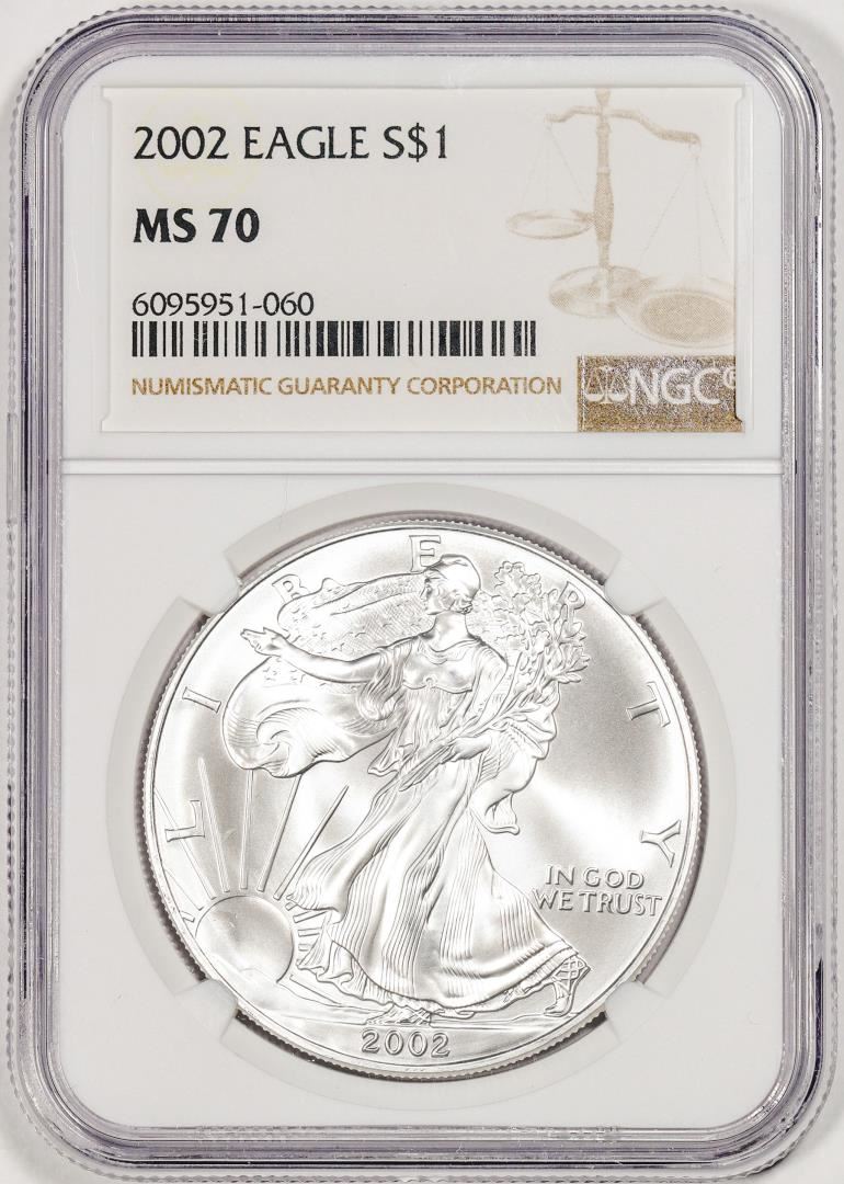 One 2002 $1 American Silver Eagle Coin NGC MS70. NGC Certified.