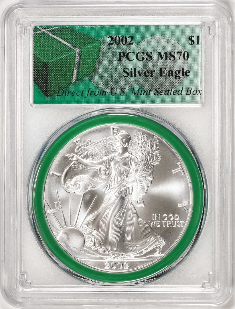 One 2002 $1 American Silver Eagle Coin PCGS MS70 Direct From U.S. Mint Sealed Box. PCGS Graded.