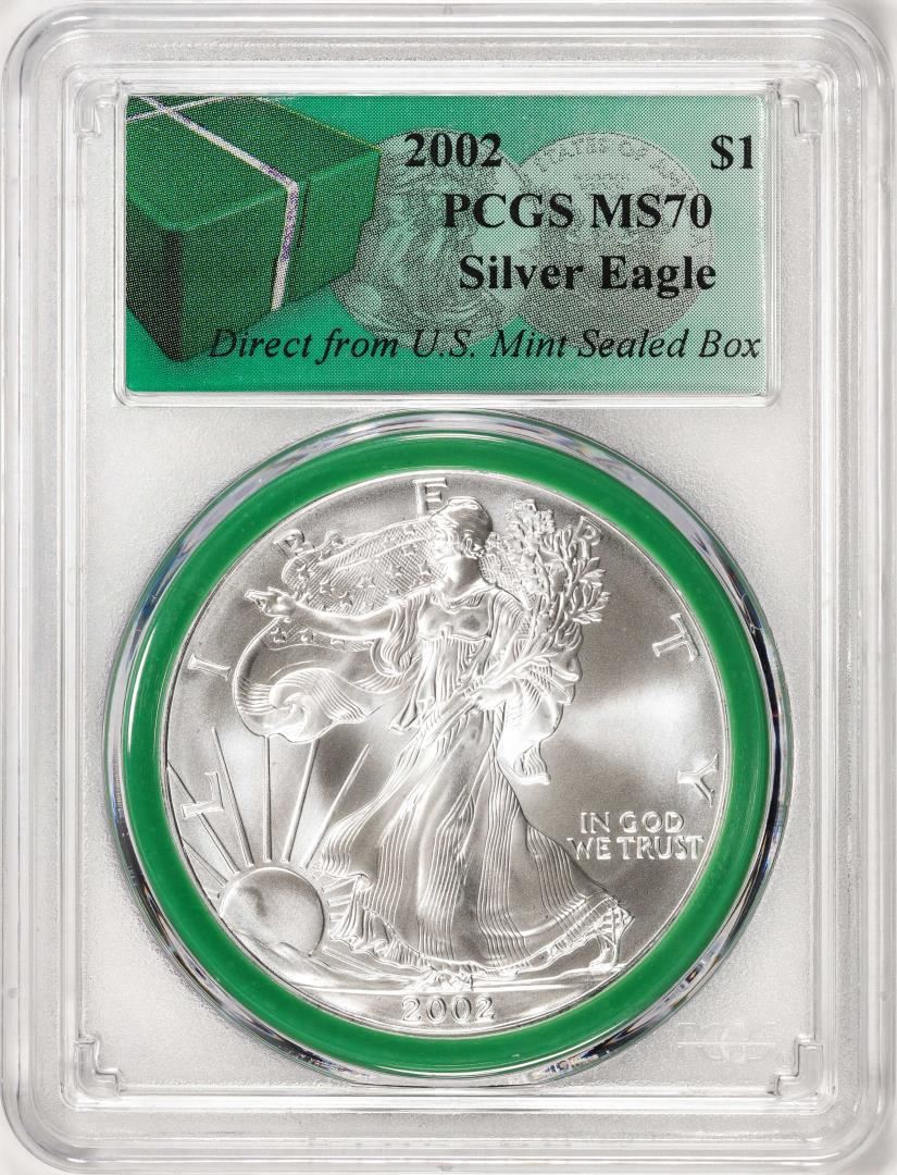 One 2002 $1 American Silver Eagle Coin PCGS MS70 Direct From U.S. Mint Sealed Box. PCGS Graded.