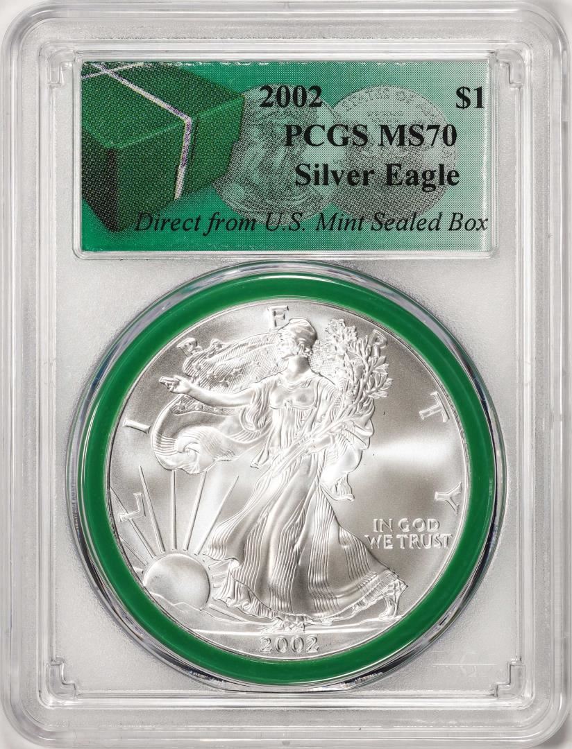 One 2002 $1 American Silver Eagle Coin PCGS MS70 Direct From U.S. Mint Sealed Box. PCGS Graded.