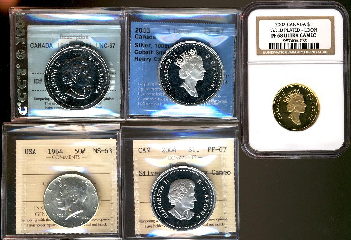 2002 $1 Gold Plated Loon NGC PF68 Ultra Cameo, 2003 $1 Cobalt CCCS PF67, 2004 $1 Ship Privy Mark CCCS UNC67, 2004 $1 Poppy ICCS PF67 UHC & 1964 US 50¢ ICCS MS63. Lot of 5 coins.