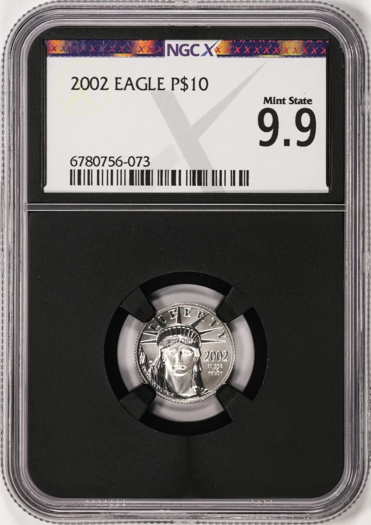 One 2002 $10 Platinum American Eagle Coin NGCX Mint State 9.9. NGCX Certified.