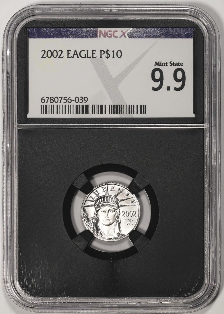 One 2002 $10 Platinum American Eagle Coin NGCX Mint State 9.9. NGCX Certified.