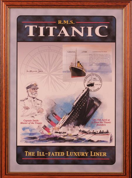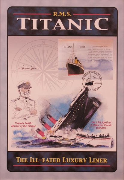 RMS Titanic Ghana first day cover with signature of Millvina Dean, the last remaining survivor of the sinking of the ship, who passed away in 2009. At 2 months and 27 days of age, she was also the youngest passenger on board the ship. Framed. Also with a reproduction Carpathia Medal.