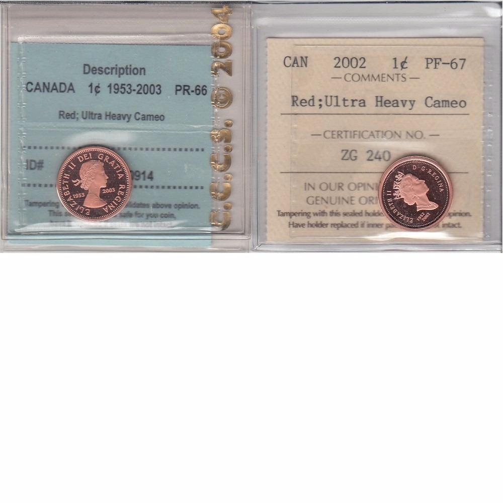 2002 & 1953-2003 Canada 1-cent Certified PF-66 and PF-67 Red; Ultra Heavy Cameo. 2pcs