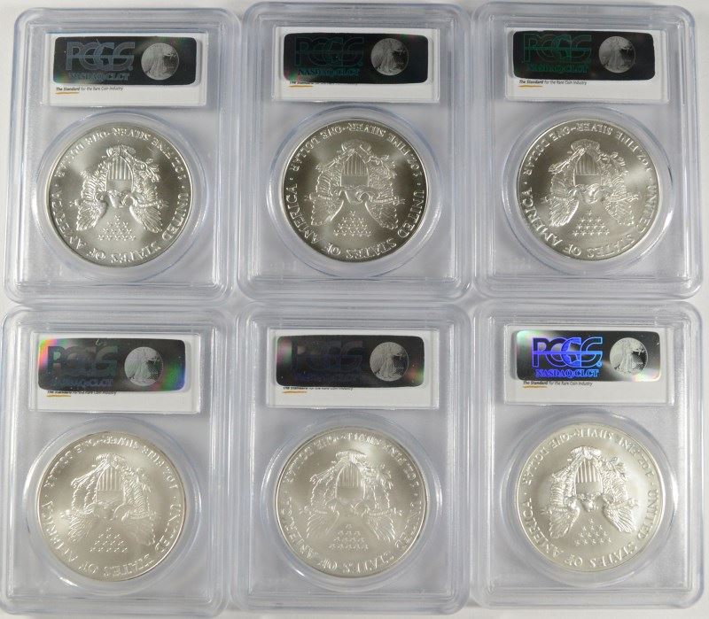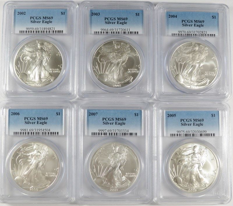 2002, 2003, 2004, 2005, 2006 & 2007 AMERICAN SILVER EAGLES, ALL PCGS MS-69!