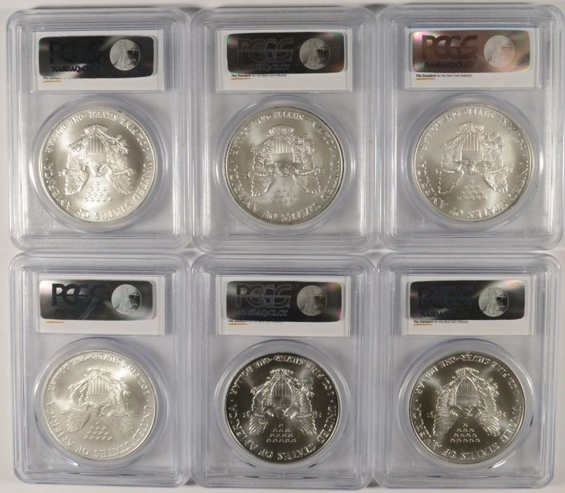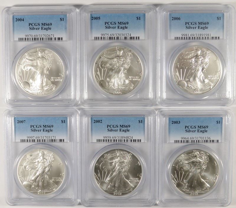 2002, 2003, 2004, 2005, 2006 & 2007 AMERICAN SILVER EAGLES, PCGS MS-69 NICE RUN!