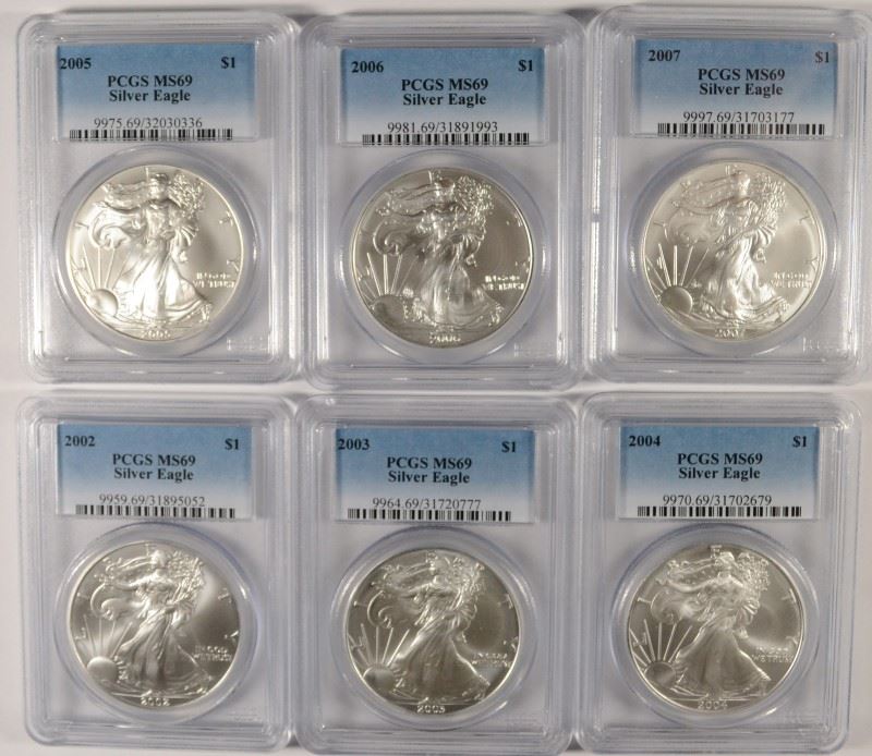 2002, 2003, 2004, 2005, 2006 & 2007 AMERICAN SILVER EAGLES, PCGS MS-69 NICE RUN!
