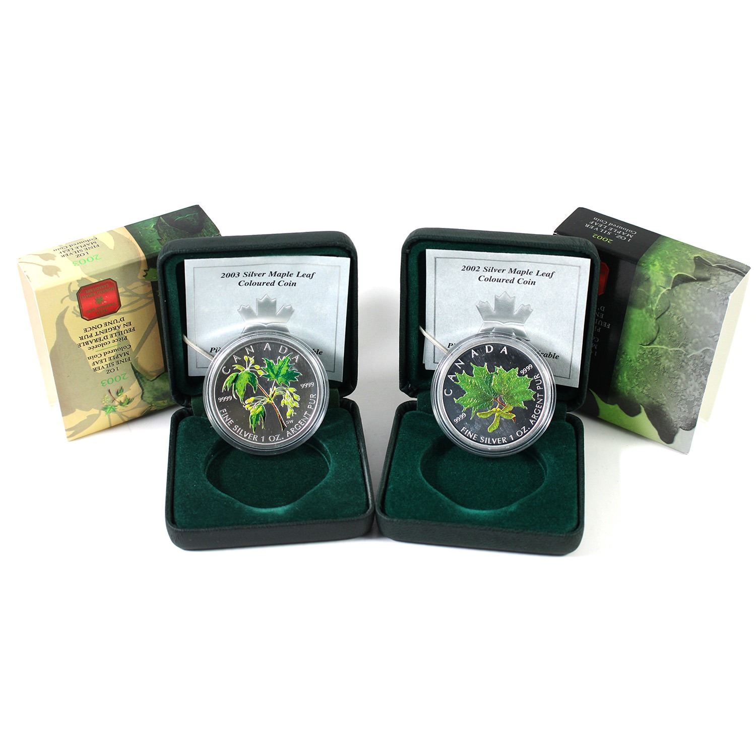 2002 & 2003 Canada 1oz Coloured Maple Leaf Fine Silver Coins (Coins are lightly toned and capsules lightly scratched). 2pcs (Tax Exempt)