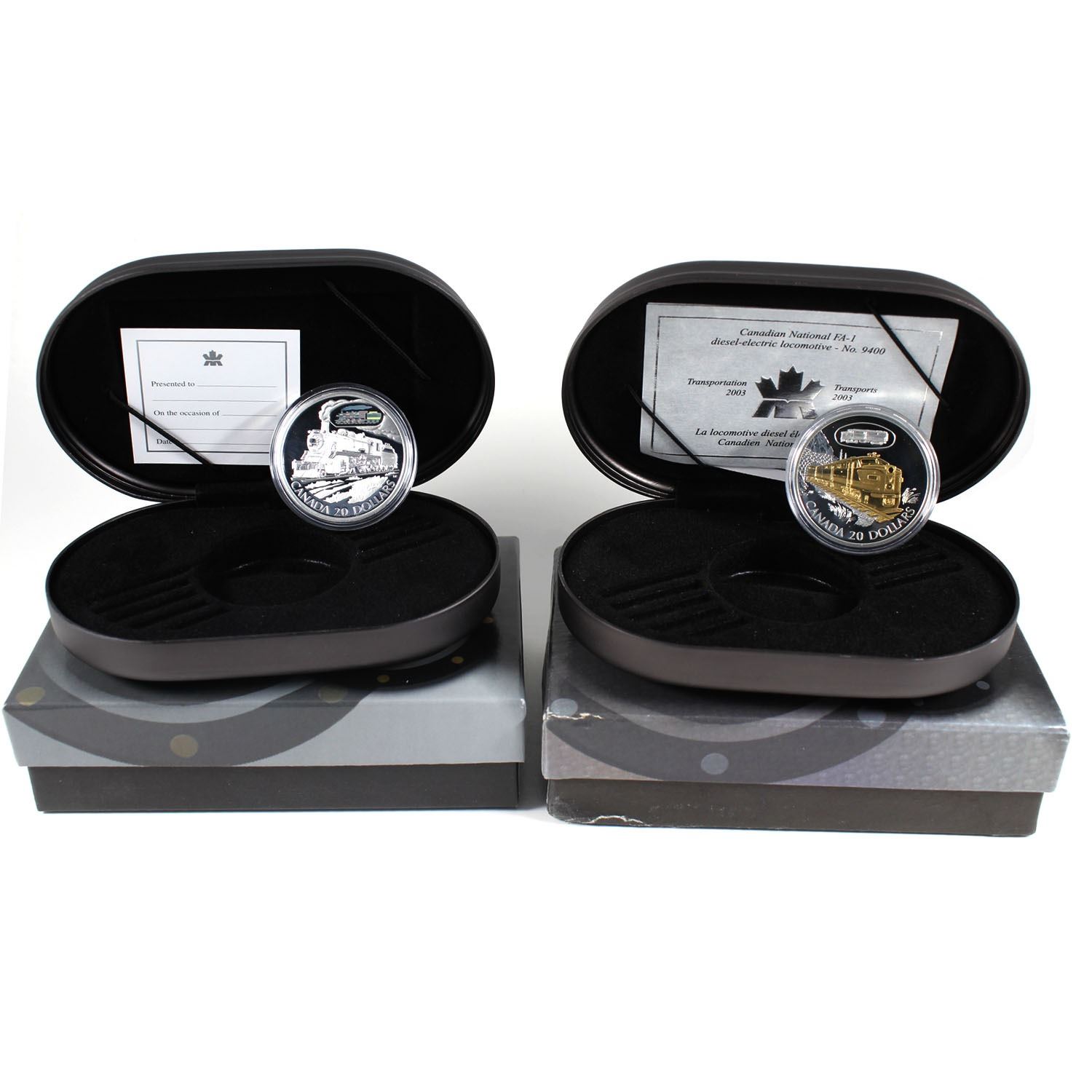 2002-2003 Canada $20 Transportation Series Sterling Silver Coins. You will receive the 2002 Train - Pacific D-10 (missing COA), and 2003 Train - CNR FA-1 Diesel Electric. 2pcs.