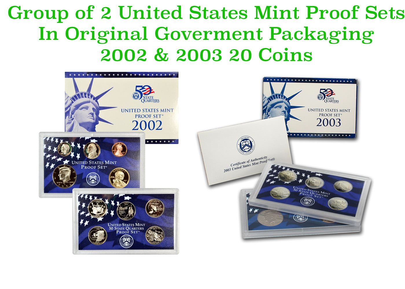 2002 & 2003 United States Mint Proof Sets. The 2002 Set contains 5 Proof State Quarters, a Proof Half Dollar, a Proof Dime, as well as 3 additional Proof coins Including the Sacagawea Proof Dollar coin. The 2003 Set contains 5 Proof State Quarters, a Proof Half Dollar, a Proof Dime, as well as 3 additional Proof coins Including the Sacagawea Proof Dollar coin. Both Complete with Original Packaging and COA.