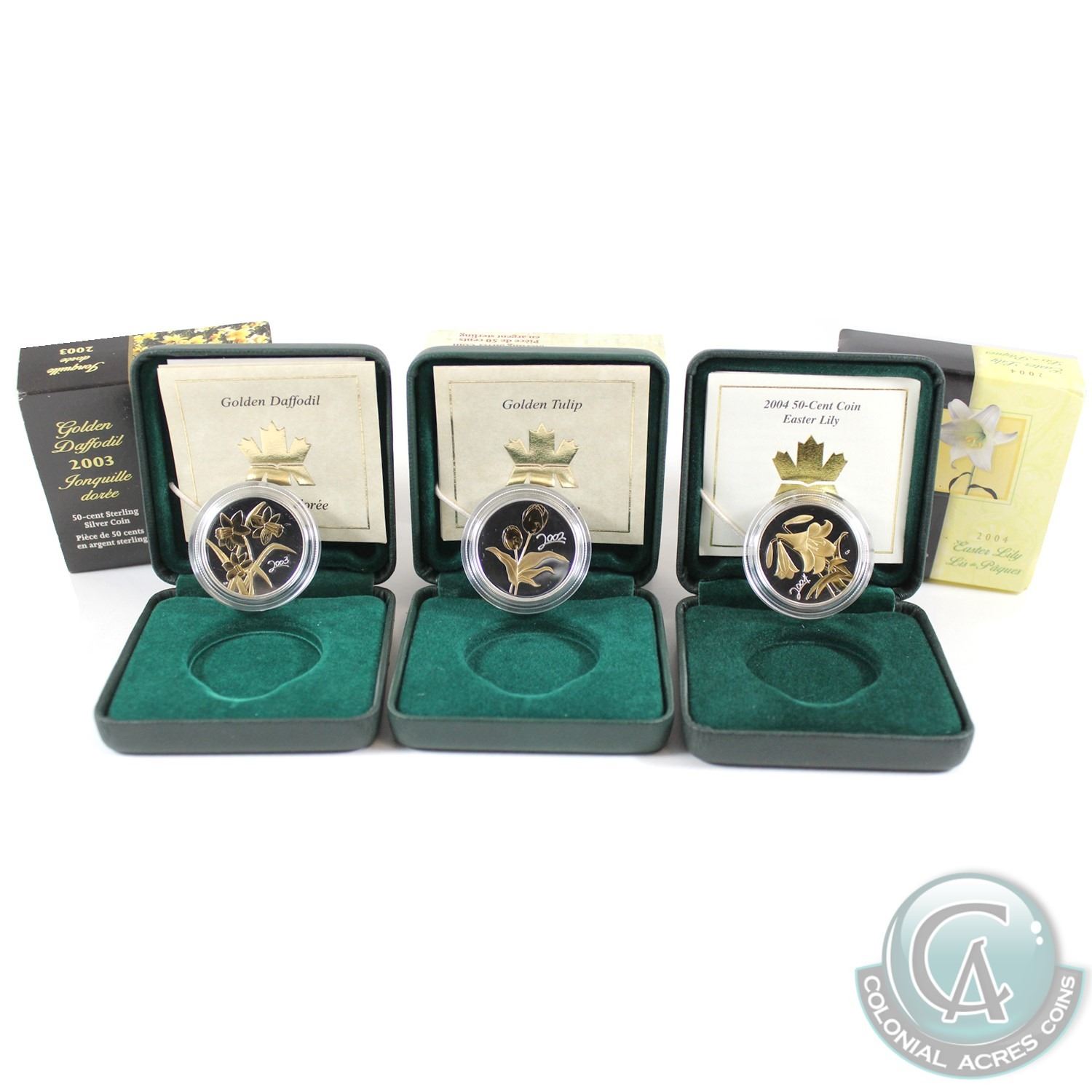 2002-2004 50-cent Canadian Flora Sterling Silver Coins - 2002 Golden Tulip, 2003 Golden Daffodil & 2004 Easter Lily. 3pcs