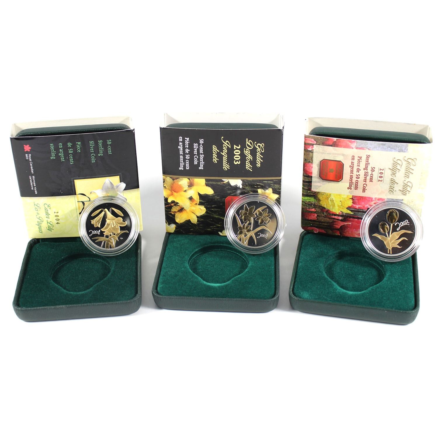 2002-2004 Canada 50-cent Sterling Silver Canadian Flora Coins: 2002 Golden Tulip, 2003 Golden Daffodil & 2004 Easter Lily. 3pcs