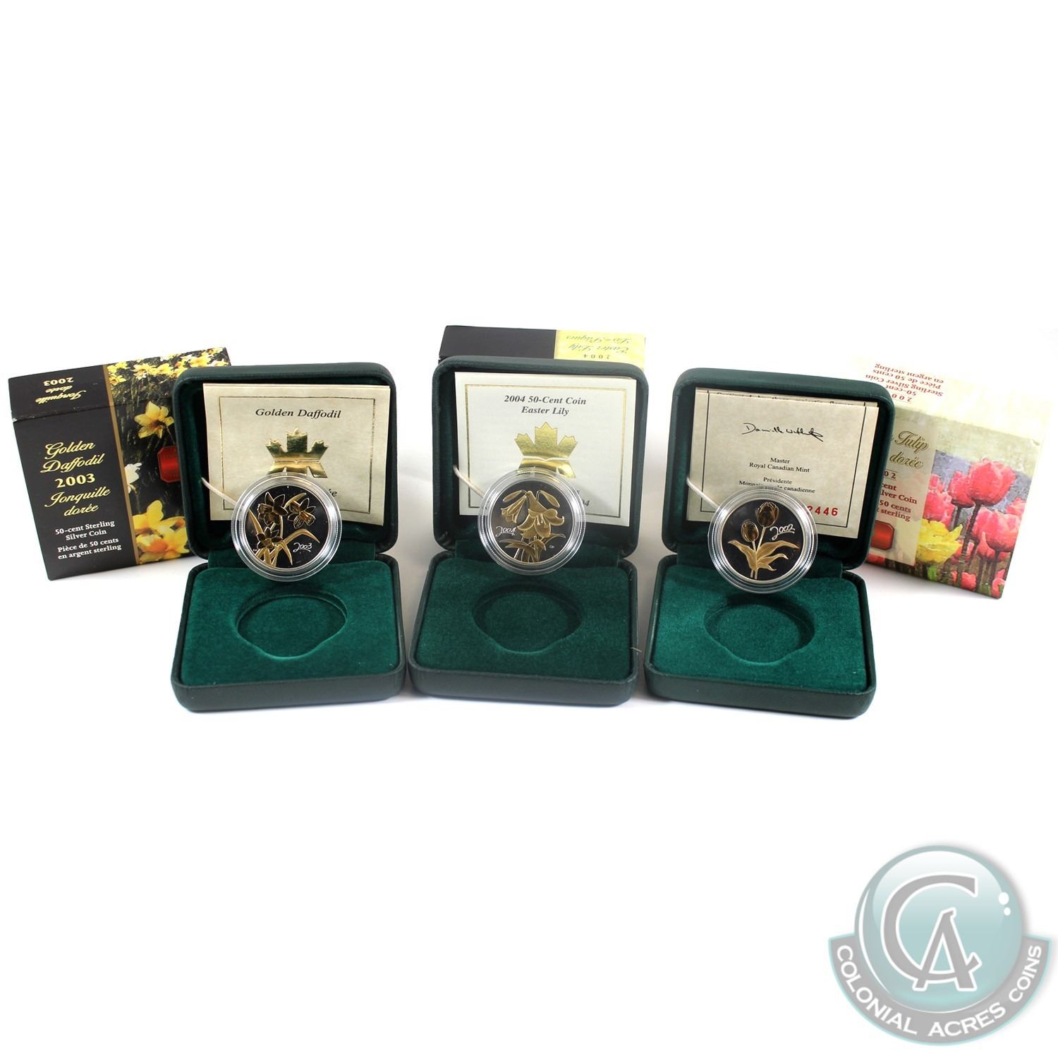 2002-2004 Canadian Flora 50-cent Gold Plated Sterling Silver Coins - 2002 Golden Tulip, 2003 Golden Daffodil (toned on back of coin & capsule lightly scuffed on back) & 2004 Golden Easter Lily. 3pcs