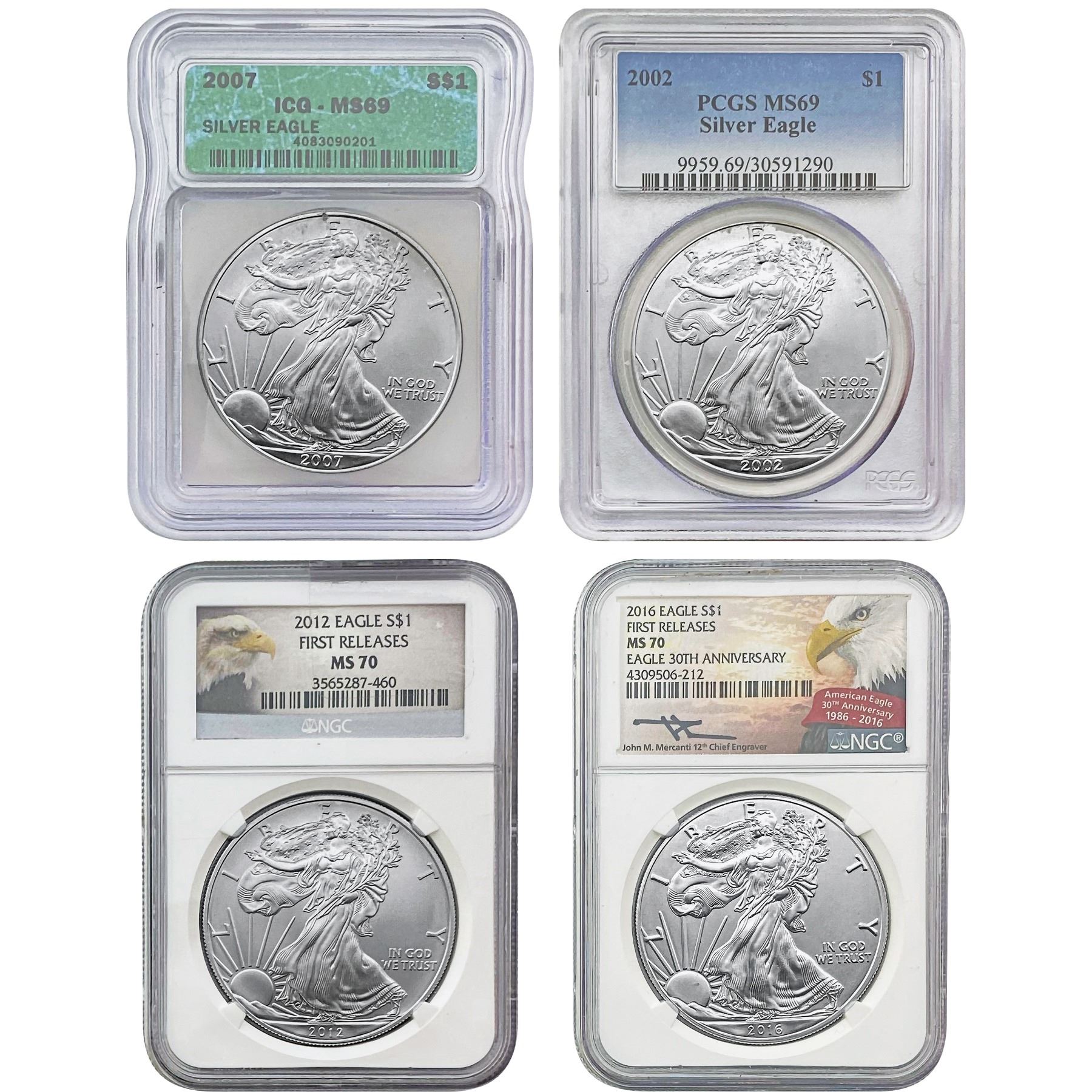 2002-2016 US Silver Eagle Lot [4 Coins] NGC/PCGS/ICG MS69/70