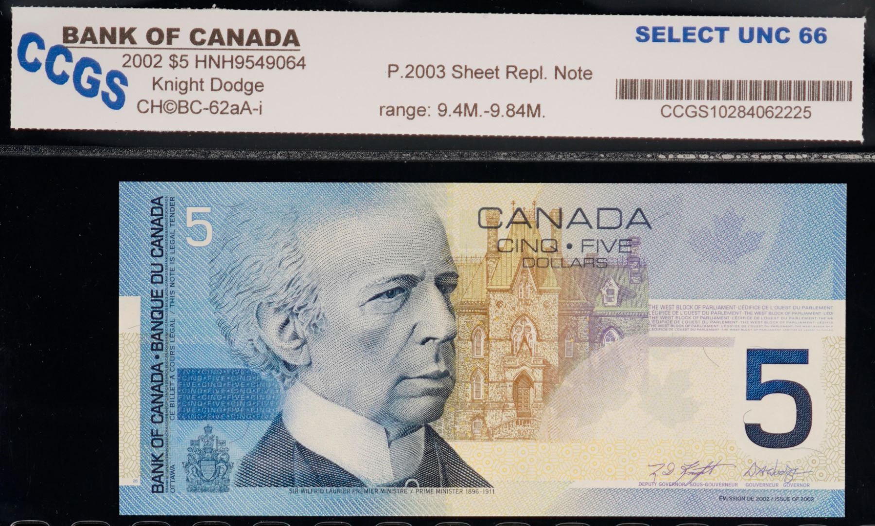 2002 $5 BC-62aA-i # HNH9549064 "9.4M - 9"84M" CCGS Superb Gem Uncirculated-66