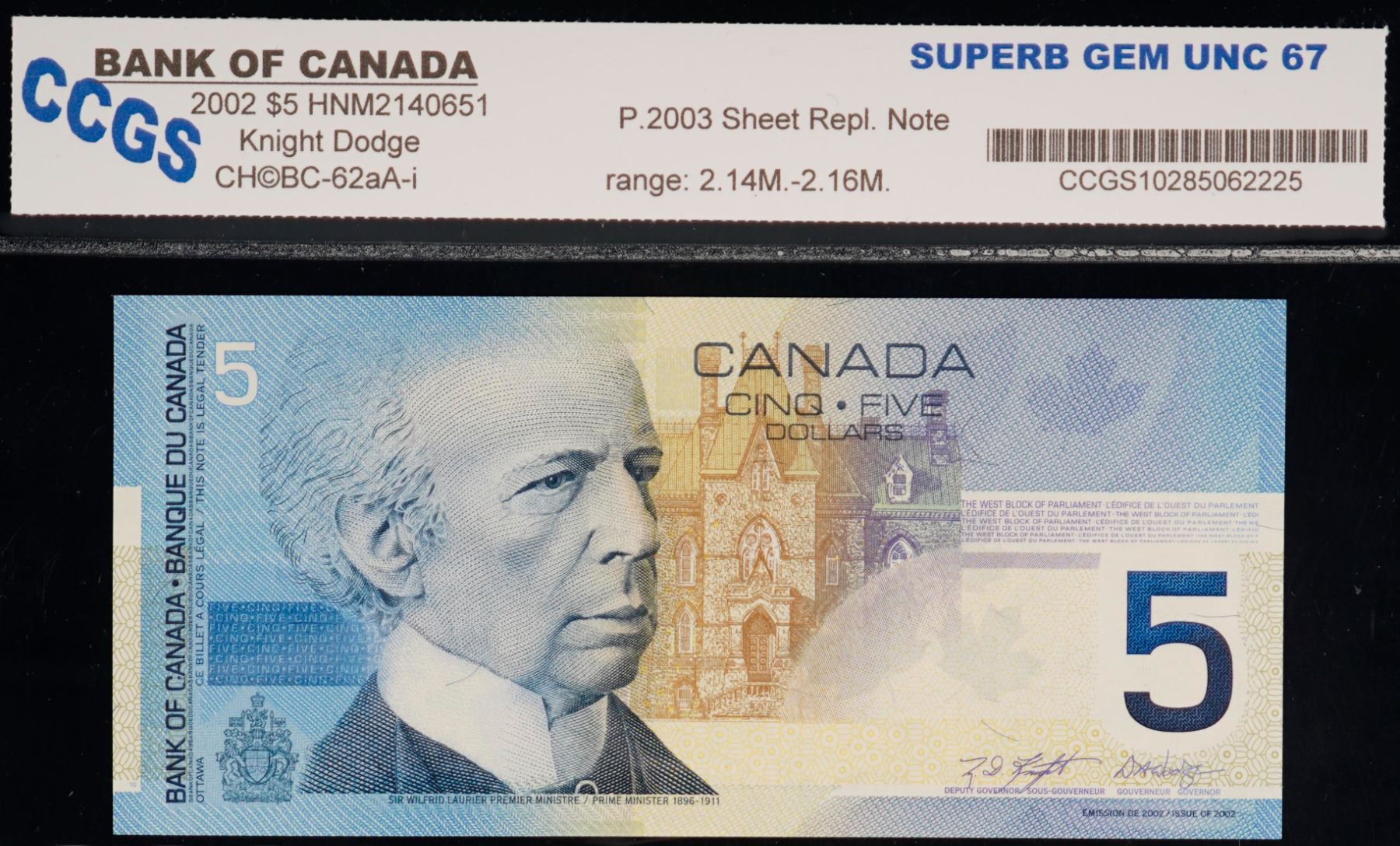 2002 $5 BC-62aA-i # HNM2140651 "2.14M - 2.16M" CCGS Superb Gem Uncirculated-67