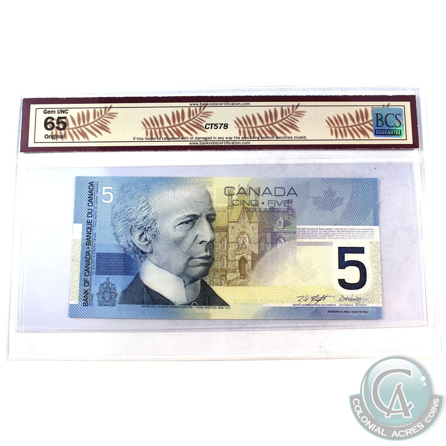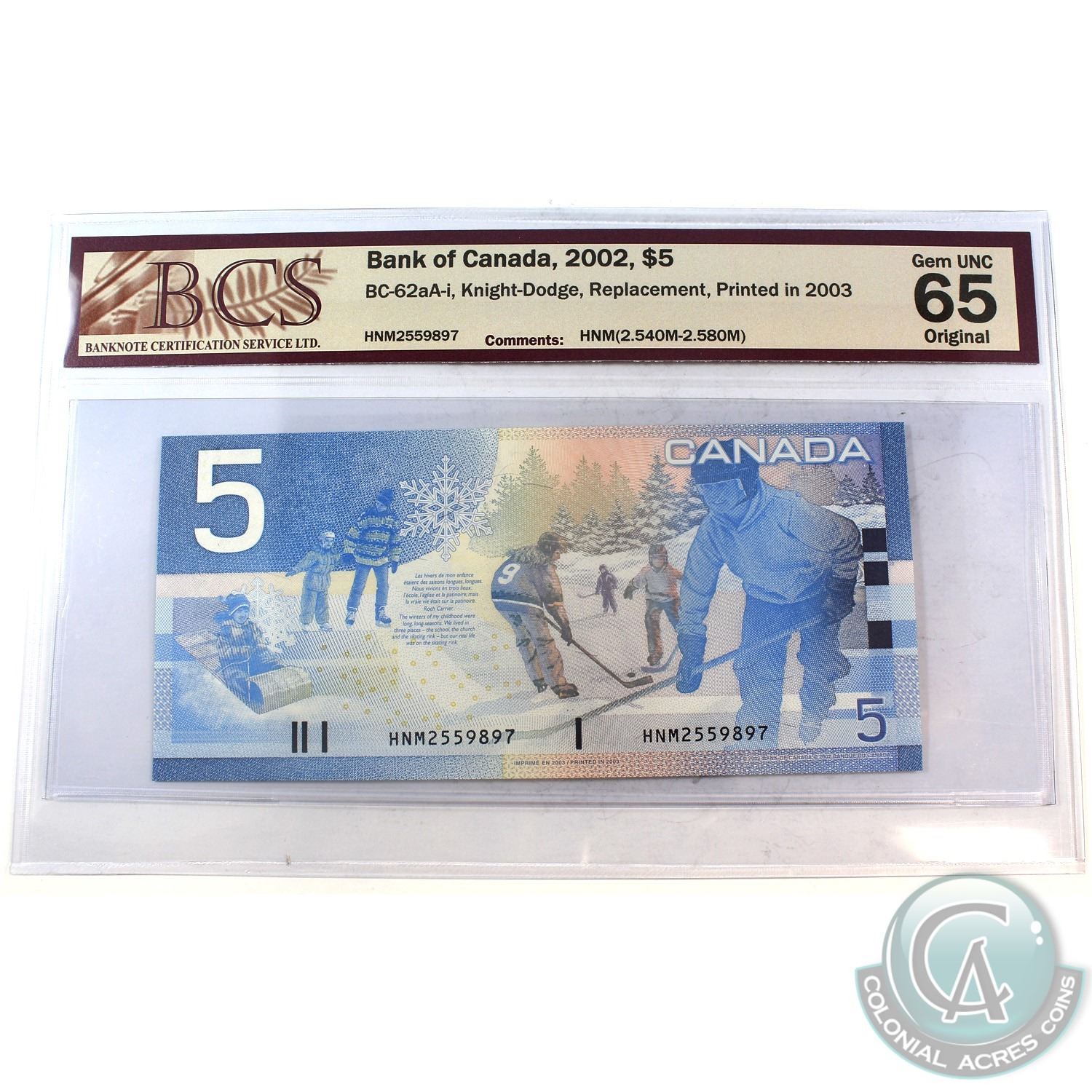 2002 $5 BC-62aA-i, Knight-Dodge, Replacement, Printed in 2003, S/N: HNM2559897 (2.540M-2.580M), BCS Certified GUNC-65 Original