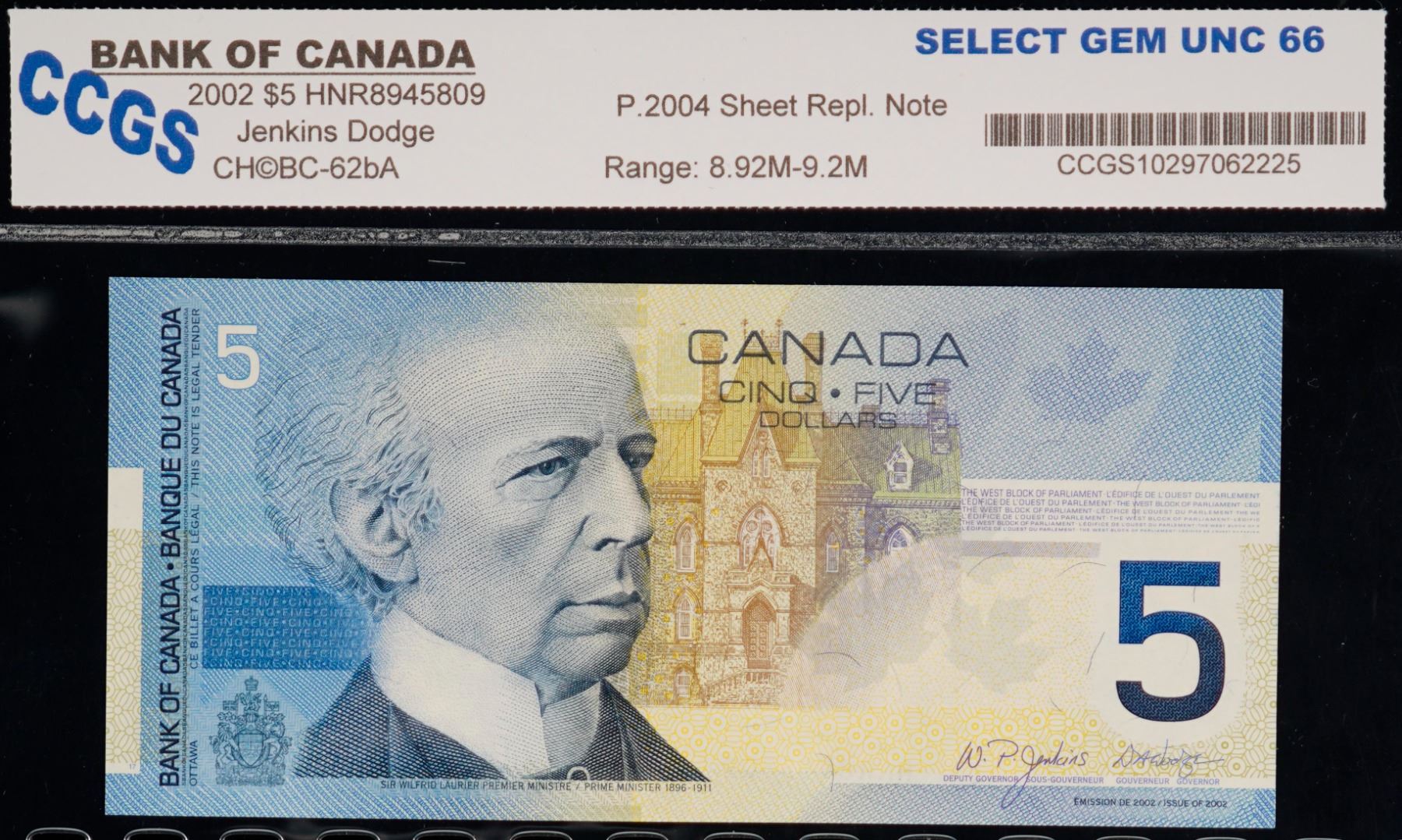 2002 $5 BC-62bA "HNR8945809 "8.92M - 9.2M" CCGS Superb Gem Uncirculated-66