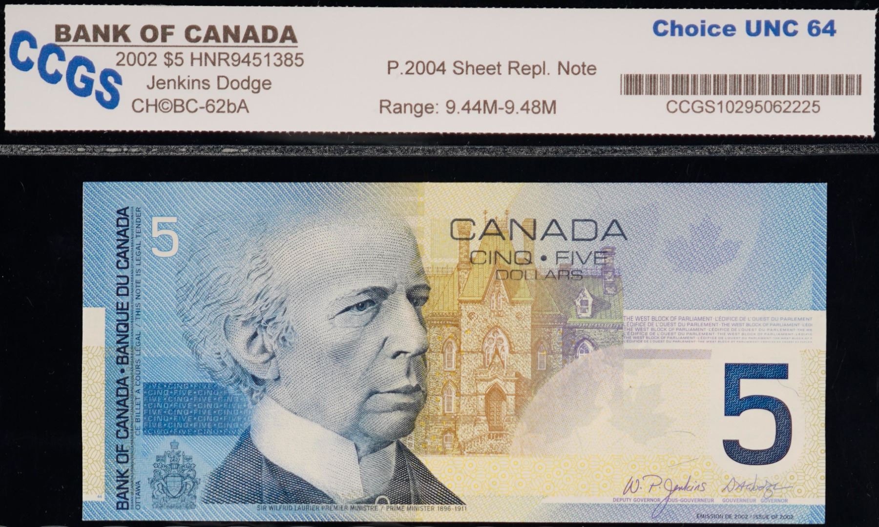 2002 $5 BC-62bA #HNR9451385 "9.44M - 9.48M" CCGS Choice Uncirculated-64