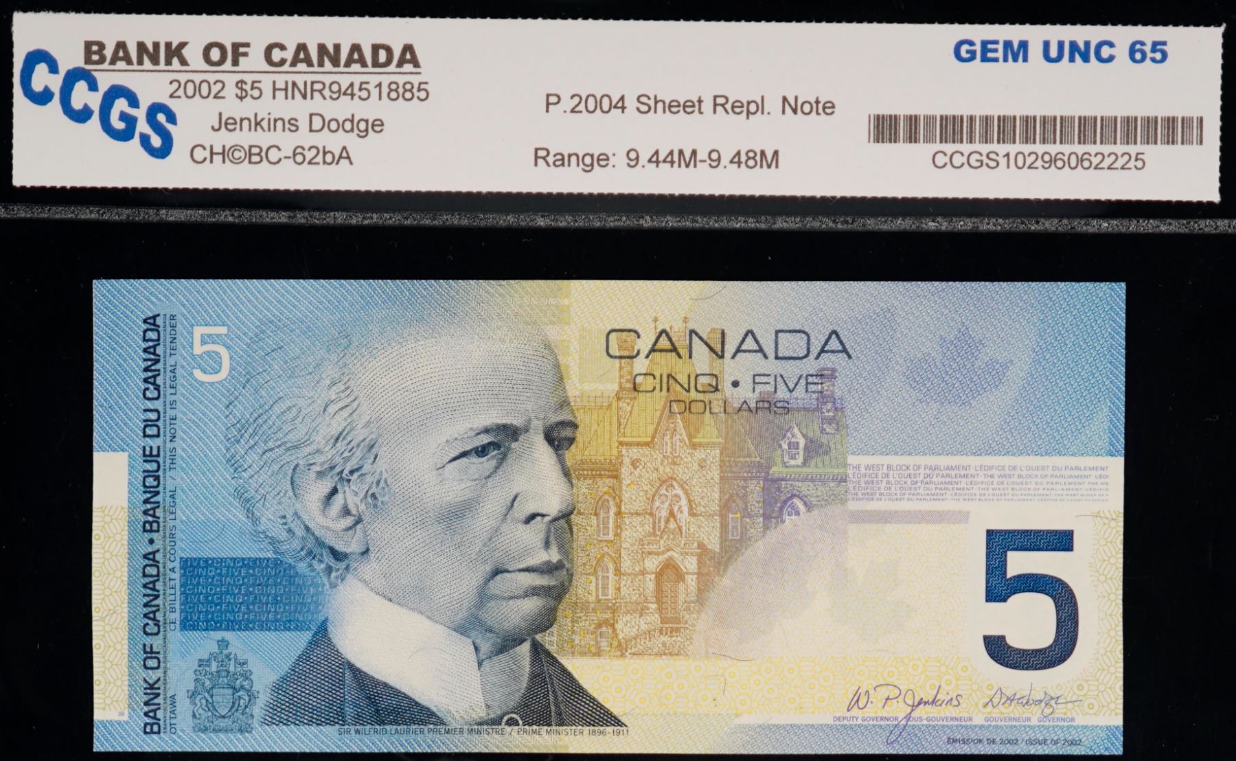2002 $5 BC-62bA "HNR9451885 #9.44M - 9.48M" CCGS Gem Uncirculated-65