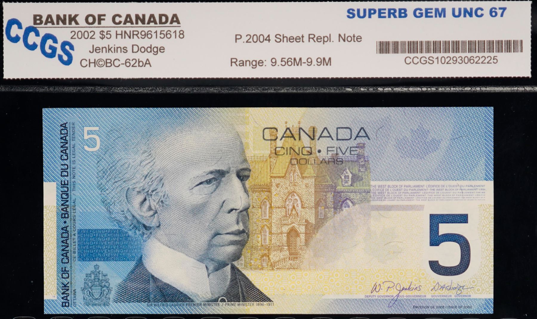 2002 $5 BC-62bA #HNR9615618 "9.56M - 9.9M" CCGS Superb Gem Uncirculated-67