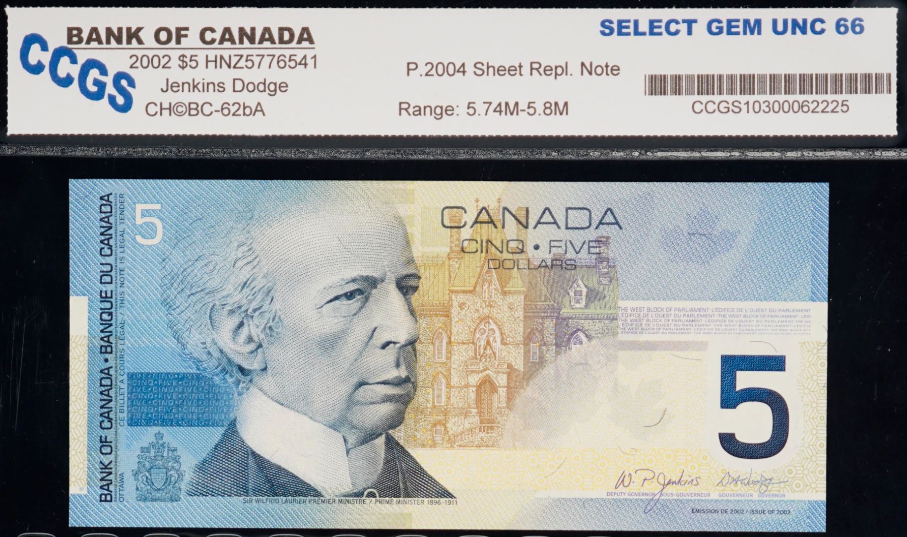 2002 $5 BC-62bA #HNZ5776541 "5.74M - 5.8M" CCGS Superb Gem Uncirculated-66