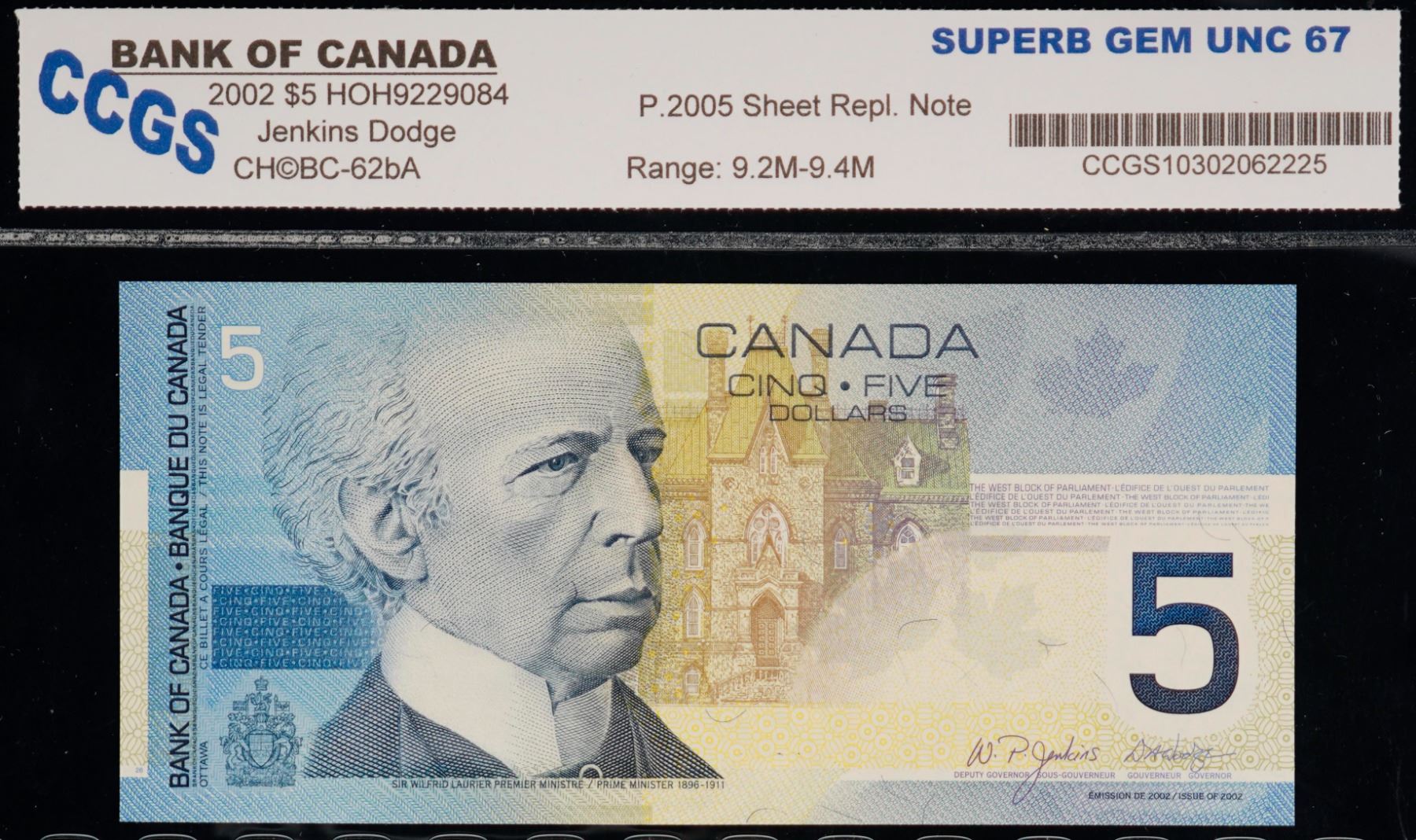 2002 $5 BC-62bA #HOH9229084 "9.2M-9,4M" CCGS Superb Gem Uncirculated-67