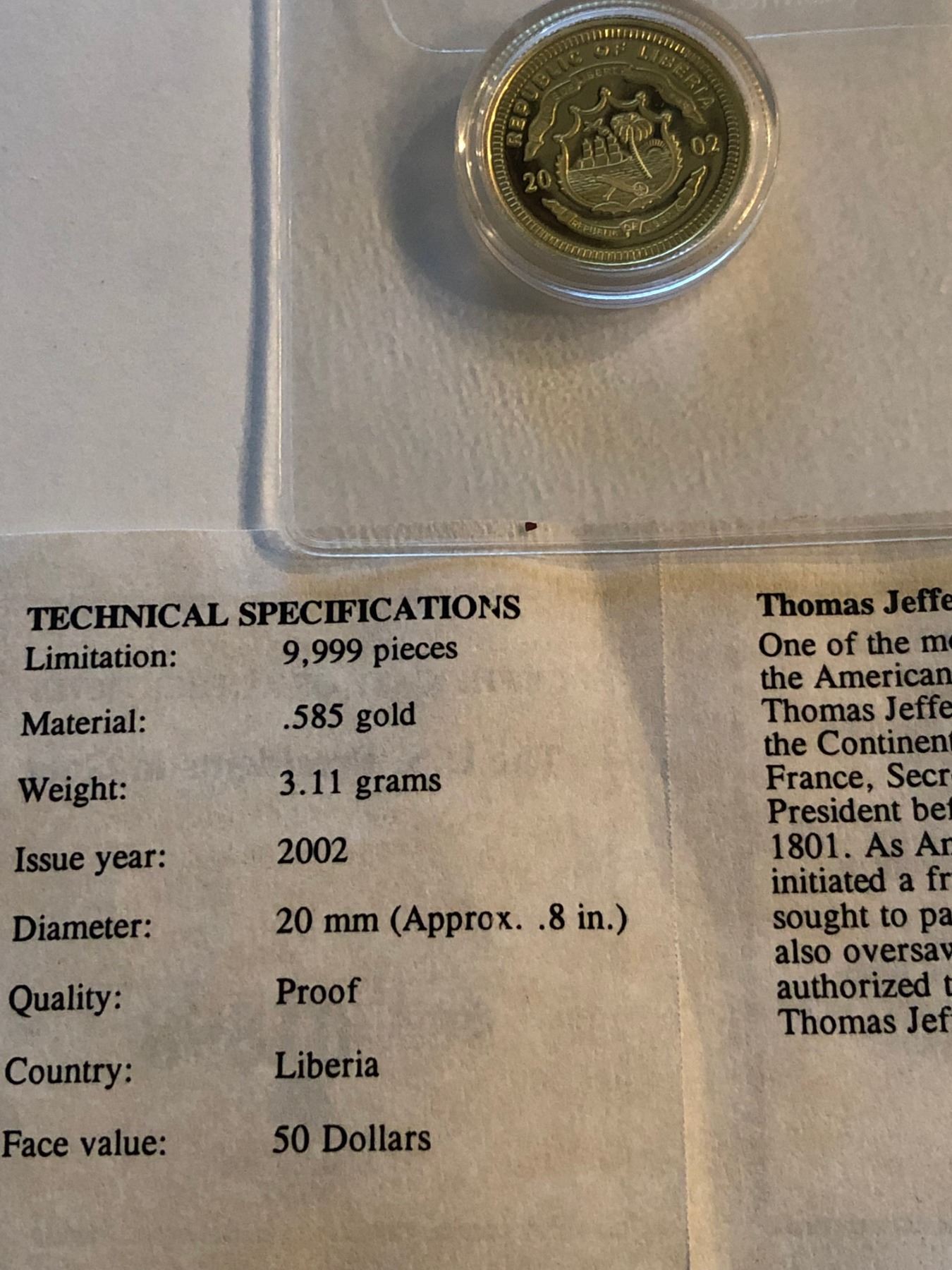 2002 50 Dollar GOLD PROOF 3.11 Grams Liberia Thomas Jefferson 585 Gold Only 9999 Pieces were made