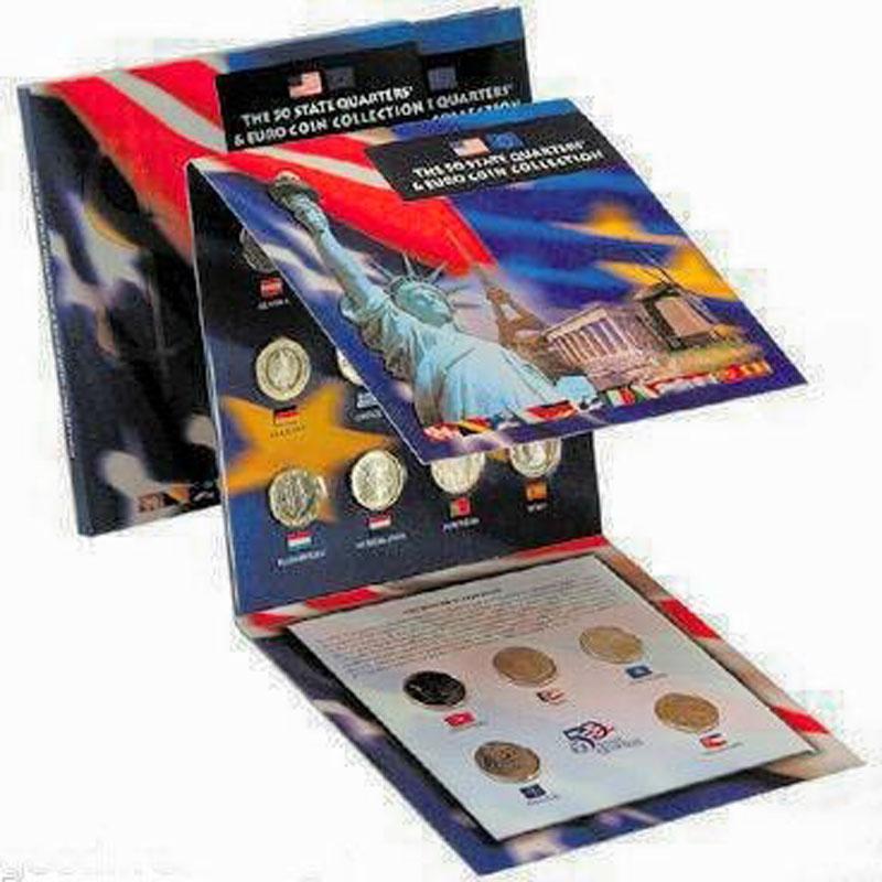 2002 was the inaugural year for the Euro coins, and this collection contains 12 1 euro coins minted by each of the participating countries: Austria, Belgium, Finland, France, Germany, Greece, Ireland, Italy, Luxembourg, Netherlands, Portugal, and Spain. Also in the set are 5 uncirculated quarters from the United States Mint 50 State Quarters Program from the states issued in 2002: Tennessee, Ohio, Louisiana, Indiana, and Mississippi. NOTE, Just an FYI, besides being an Inaugural year Mint Set, with unique USA/Euro collection, the face value is $1.45 USD per Euro coin, of which the set has 12 and $1.25 USD in US state quarters, that makes this set have a face value of $18.65. Estimated Value $50