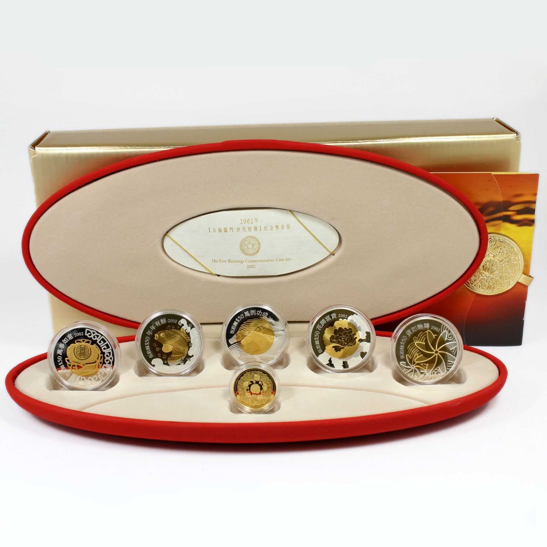 2002 $50 The Five Blessings Commemorative Sterling Silver 5-coin and Fine Gold Medallion Set. This set is a joint issue from the Hong Kong Monetary Authority & the Royal Canadian Mint and features 5 sterling silver coins with gold plating that have a Hong Kong $50 face value also with a 1/4oz fine gold medallion. Mintage of 60,000 sets worldwide.