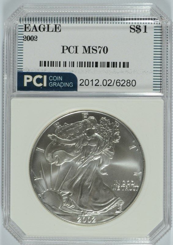 2002 AMERICAN SILVER EAGLE, PCI MS-70 RARE TRENDS PRICE $1250.00