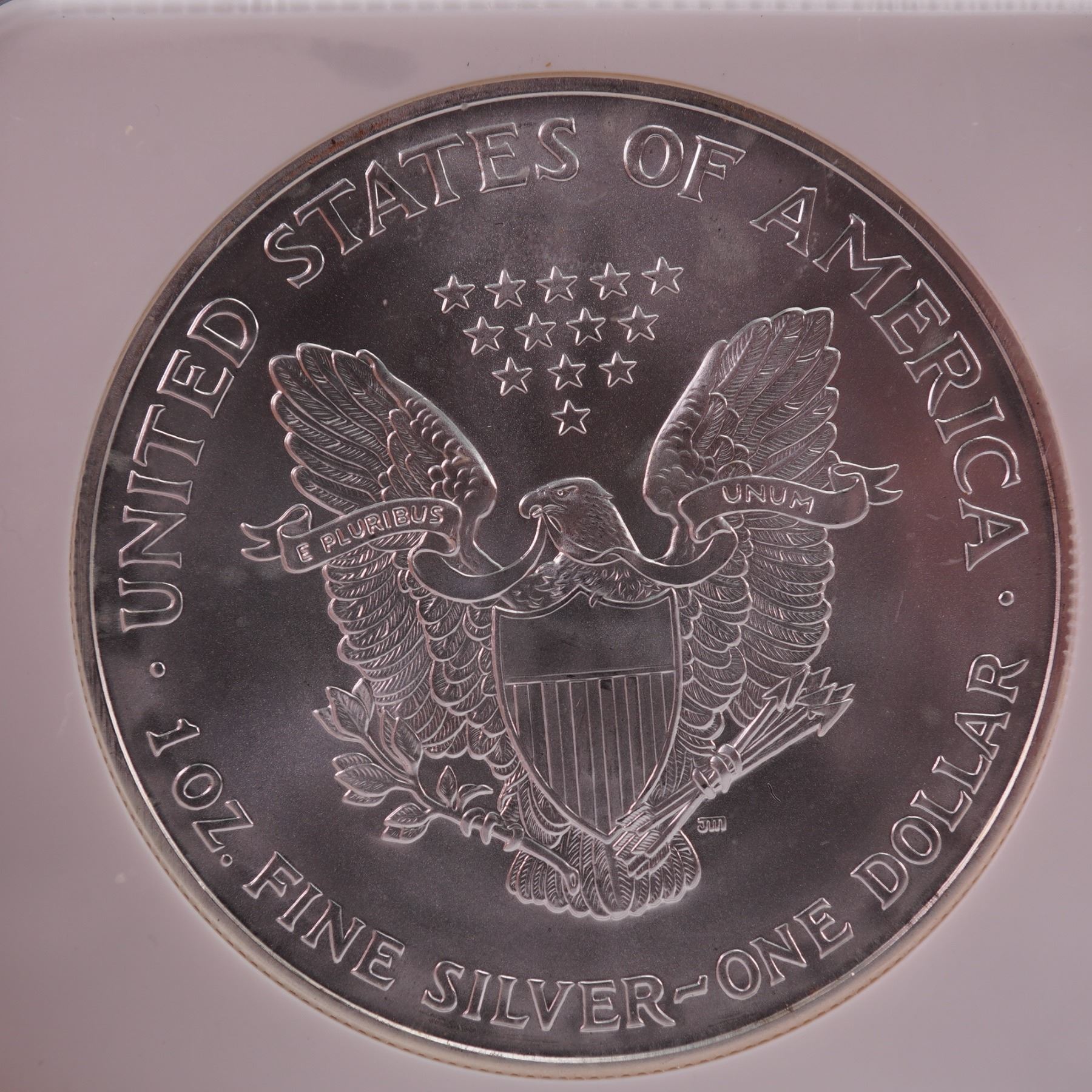 Struck in one troy ounce of .999 fine silver, this 2002 American Silver Eagle certified by NGC and graded Mint State 69. The coin bears the iconic Walking Liberty design by Adolph A. Weinman, originally featured on the half dollar from 1916 to 1947. The obverse presents Lady Liberty striding confidently toward the rising sun, enveloped in the American flag with her arm outstretched and branches of laurel and oak in hand, symbolizing both civil and military glory. The reverse, designed by John Mercanti, showcases a heraldic eagle with a shield, arrows, and olive branch, beneath a triangular arrangement of thirteen stars representing the original colonies. Enclosed in a graded NGC holder for further preservation and authentication. Slab measures: 2.25"L x 0.25"W x 3.25"H. Coin diameter: 40.6 mm.