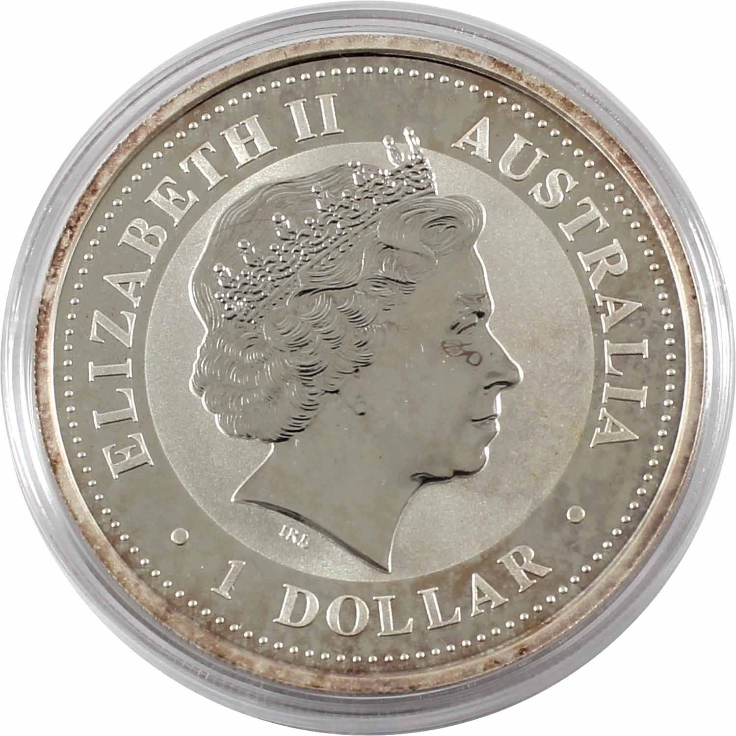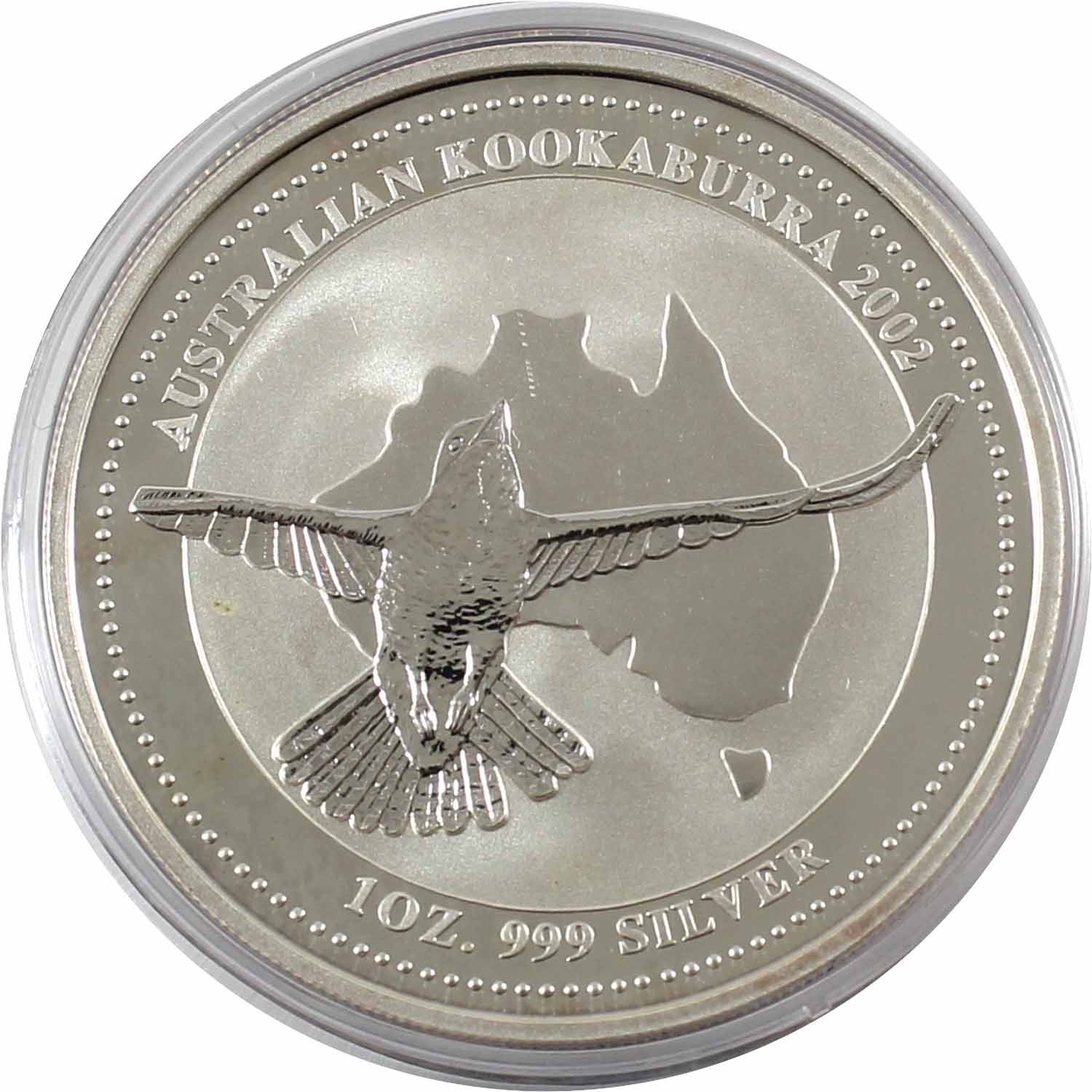 2002 Australia $5 1oz Kookaburra Fine Silver Coin in Capsule (lightly toned). 3rd lowest mintage year of only 91,604!!! (TAX Exempt)