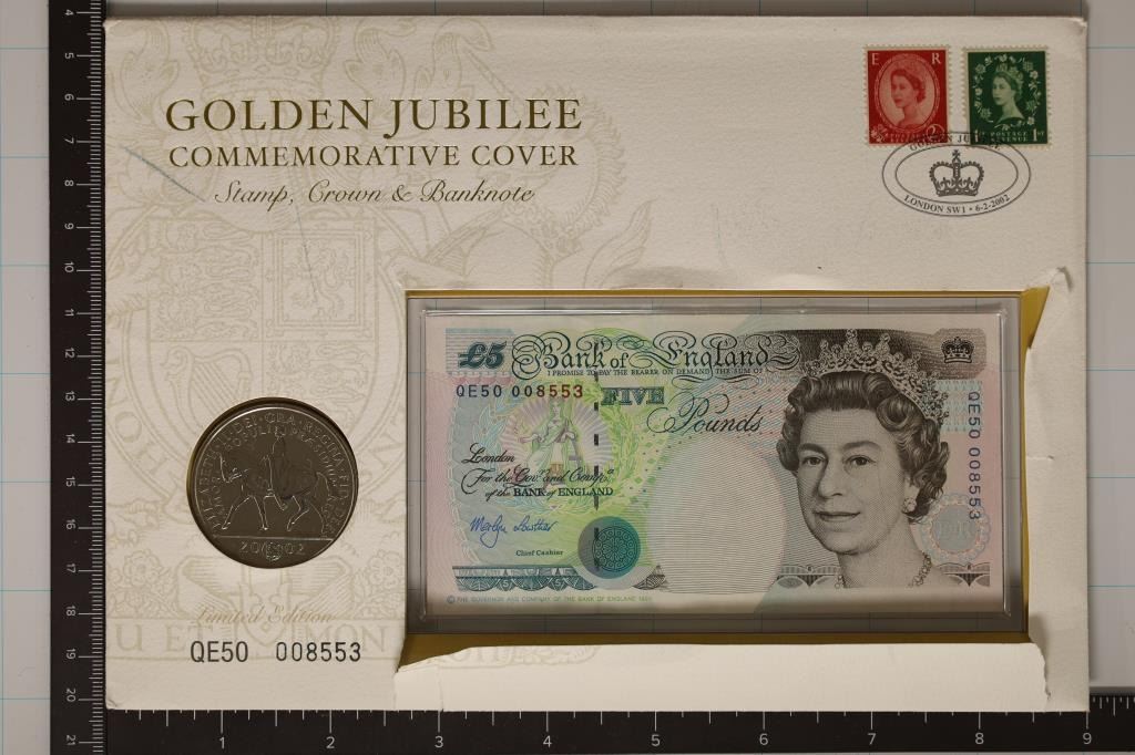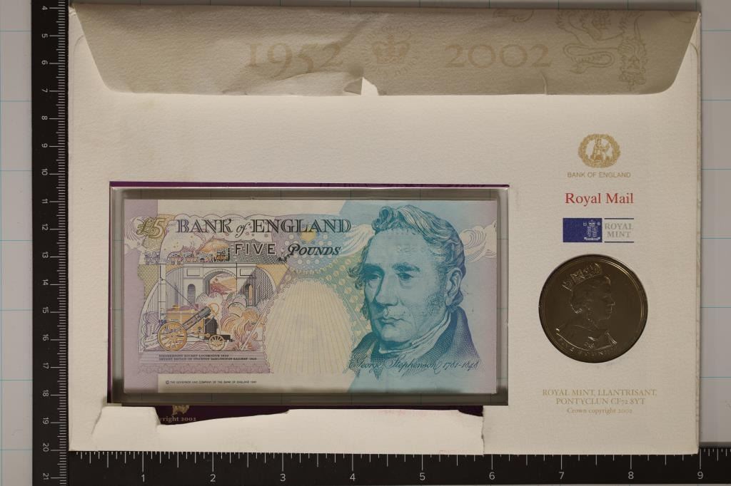 COIN AND BANK NOTE COVER: 5 POUND CRISP UNC BILL, BRILIANT UNC 5 POUND COIN IN ORIGINAL ROYAL MAIL ENVELOPE WITH CANCELLED STAMPS. BOTTOM OF ENVELOPE IS DAMAGED