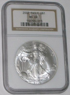 2002 CERTIFIED 1oz SILVER EAGLE *CERTIFIED BY NGC MS-69*!! SILVER EAGLE CAME OUT OF SAFE!! ***Coin, Currency & All Items Listed in this auction - Grades, Conditions and Values are not Safe Deposit Coins LLC Responsibilty. Grades, Condition and Values are determined by Consigner(s) & Buyers ONLY