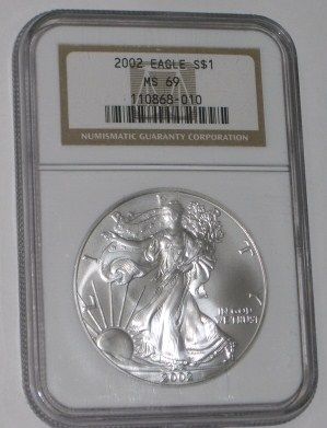 2002 CERTIFIED 1oz SILVER EAGLE *CERTIFIED BY NGC MS-69*!! SILVER EAGLE CAME OUT OF SAFE!! ***Coin, Currency & All Items Listed in this auction - Grades, Conditions and Values are not Safe Deposit Coins LLC Responsibilty. Grades, Condition and Values are determined by Consigner(s) & Buyers ONLY
