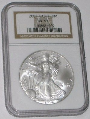 2002 CERTIFIED 1oz SILVER EAGLE *CERTIFIED BY NGC MS-69*!! SILVER EAGLE CAME OUT OF SAFE!! ***Coin, Currency & All Items Listed in this auction - Grades, Conditions and Values are not Safe Deposit Coins LLC Responsibilty. Grades, Condition and Values are determined by Consigner(s) & Buyers ONLY