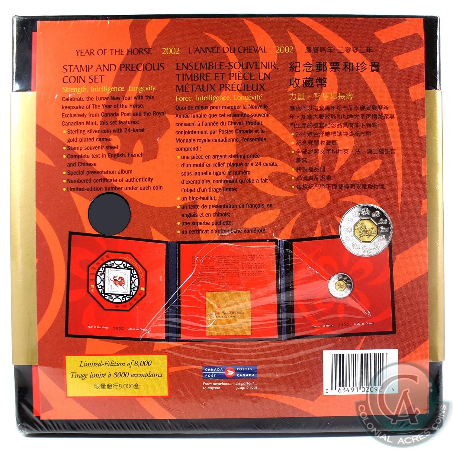 2002 Canada $15 Year of the Horse Sterling Silver and Gold Plated Cameo Coin and Stamp Set with all Original Packaging from the RCM and Canada Post. *Mostly sealed*