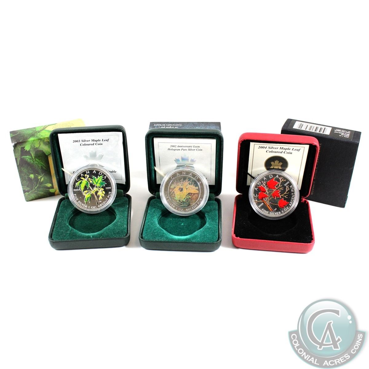 2002 Canada $5 Hologram Loon & 2003-2004 Canada $5 Coloured Silver Maples (Tax Exempt). Please note the 2003 has spotting. 3pcs.