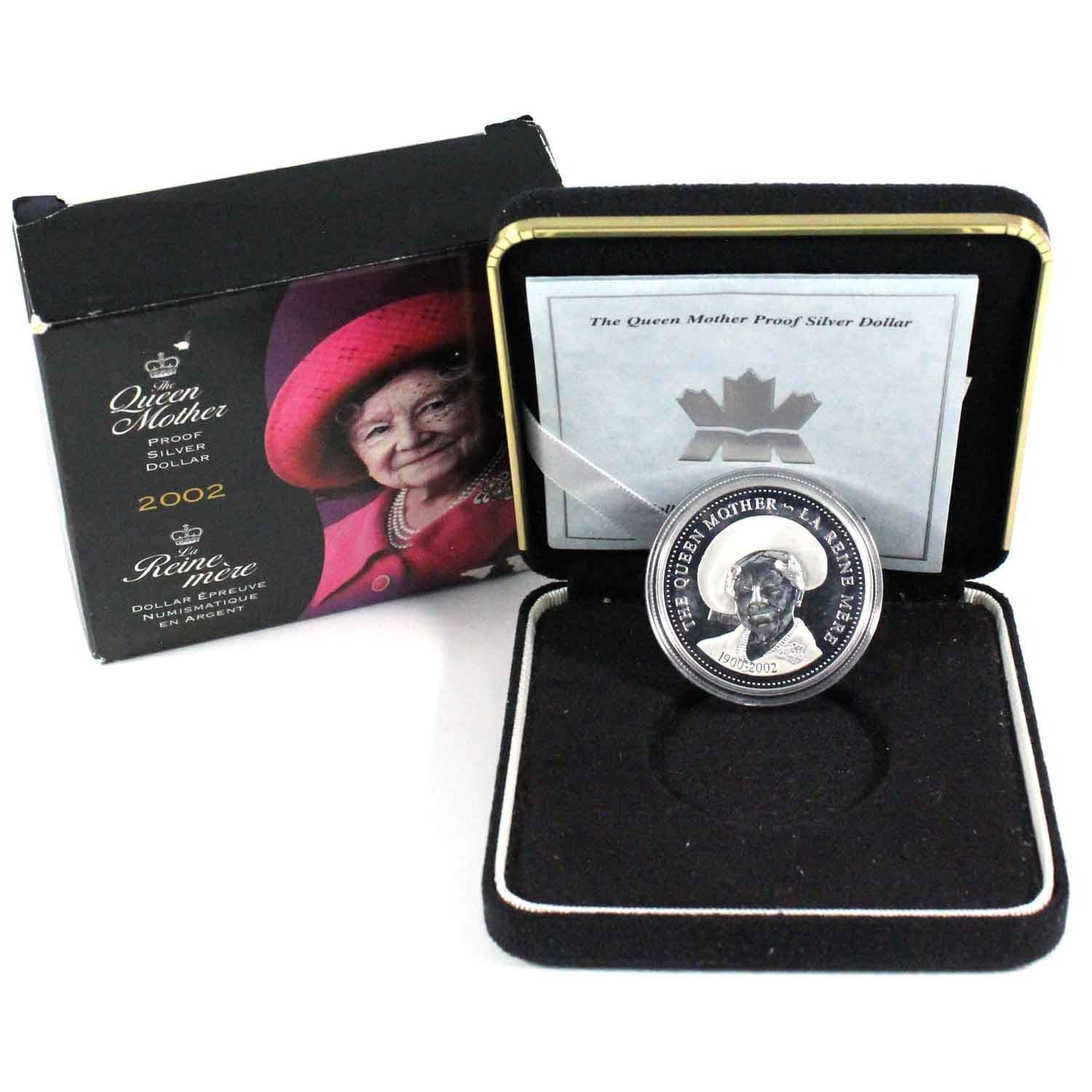 2002 Canada Queen Mother Proof Sterling Silver Dollar (Lightly toned on back of coin, capsule is scuffed & sleeve is worn).