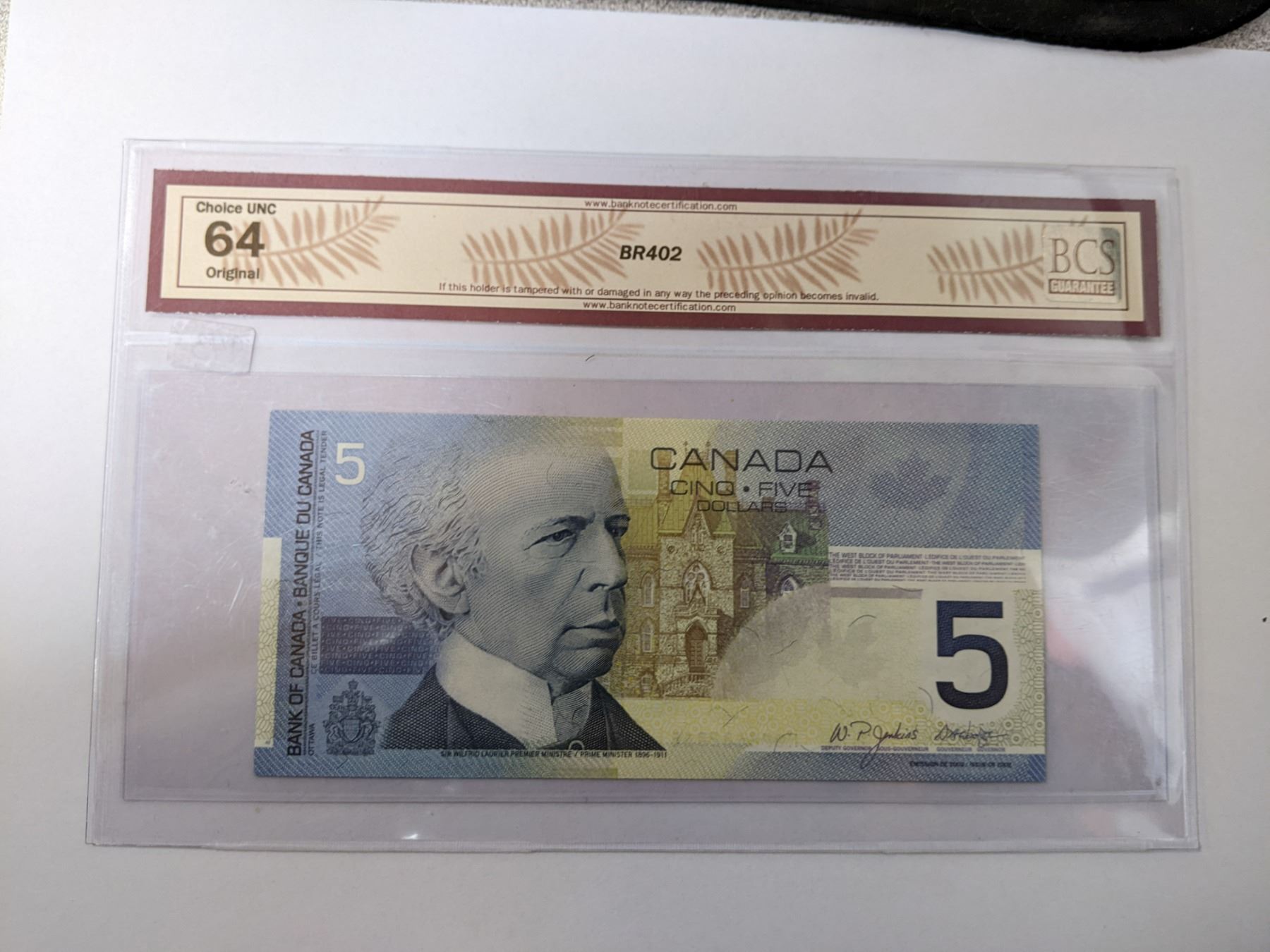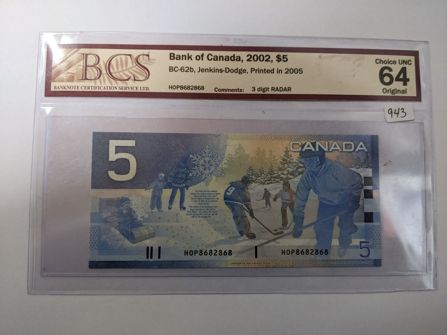 2002 Canadian $5 Bill - BCS Graded, 3 digit Radar Serial #, Choice UNC 64