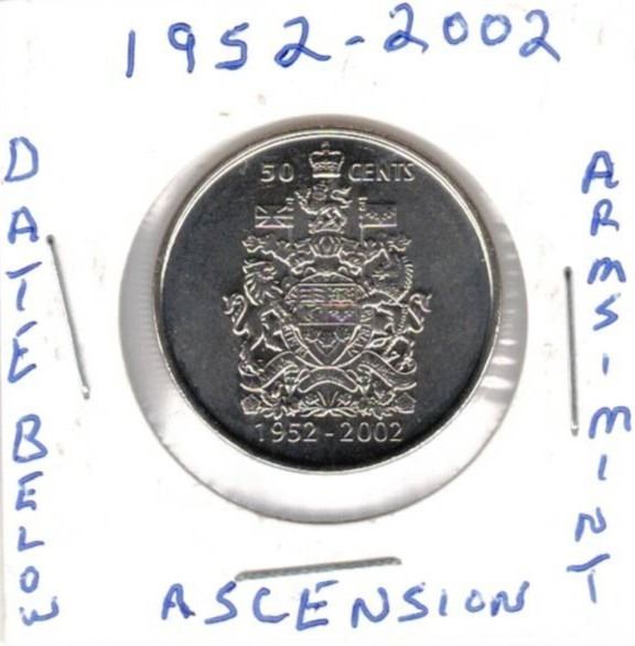 2002 Canadian Half Dollar,1952-2002,Date Below Arms,Ascension,MINT