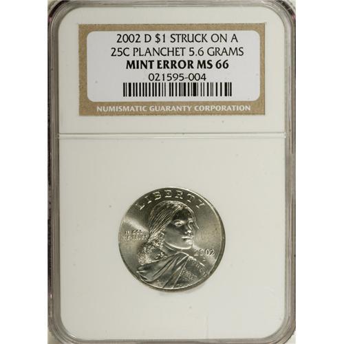 <B>2002-D SAC$1 Sacagawea Dollar--Struck on a Quarter Planchet--MS66 NGC.</B></I> 5.6 grams. A remarkable piece with brilliant light gray surfaces and exceptional luster. This error would be difficult to spot, due to the similar planchet size, although the color difference is unmistakable.<BR><BR><b>Shipping:</b> Coins & Currency (<a target="_blank" href="http://www.heritageauctions.com/common/shipping.php">view shipping information</a>)
