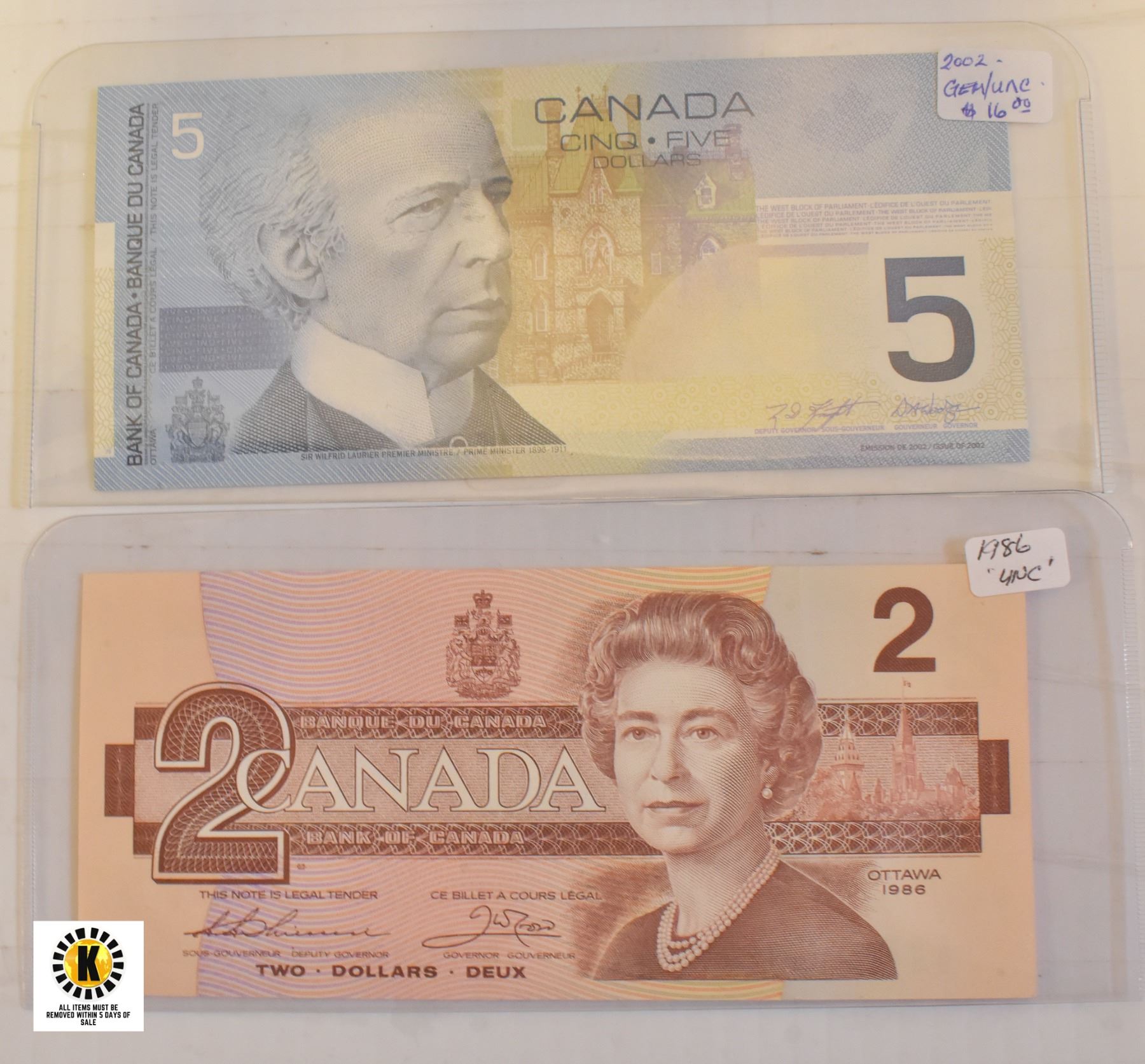 2002 FIVE DOLLAR AND 1986 TWO DOLLAR BILLS