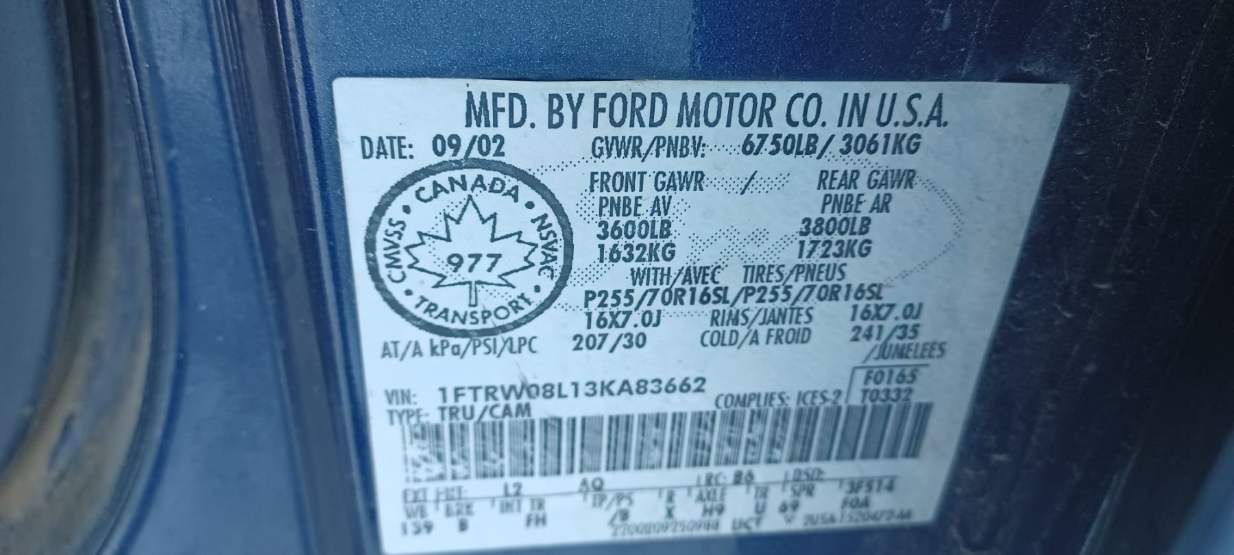 2002 FORD F-150 CREW CAB 4X4 RUNS WELL ELECTRIC DOORS/ WINDOWS AC CB RADIO SN 1FTRW08L13KA83662, SPARE PARTS SOLD LOT 1012A